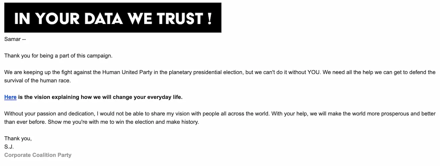 - 次へのステップとして政治的ビジョンと政治キャンペーンの体験をより未来的で、より探究的にするために何ができるかを考えることが鍵になる