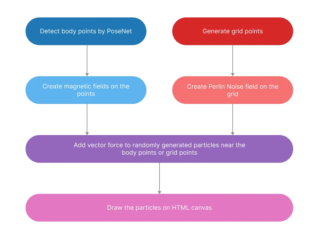 今回、ユーザーの体そのものではなく、その動きの軌跡を視覚化することにしました理由は、ユーザーの体がどれだけ広範囲に動くかを知るための動作エクササイズのため。複雑な相互作用を加えることで体験をより楽しく、探索的にするために、軌跡自体を示すのではなく、フローフィールドの相互作用を選択。